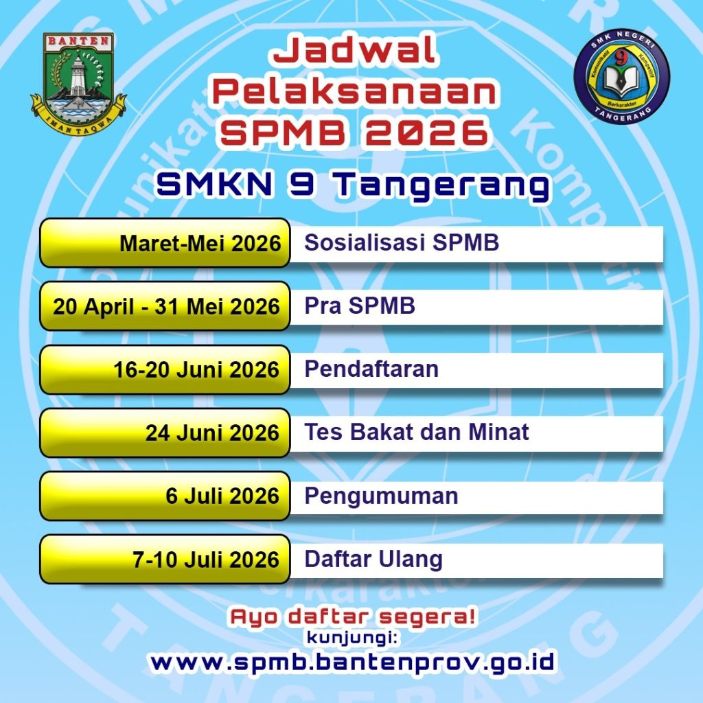 Salam sejahtera untuk kita semua terutama untuk masyarakat yang hendak mencari informasi mengenai SPMB Tahun Ajaran 2025 – 2026 di SMK Negeri 9 Tangerang. Berikut informasi mengenai Pendaftaran Peserta Didik Baru ini bisa dilihat dihalaman ini. Terima Kasih.